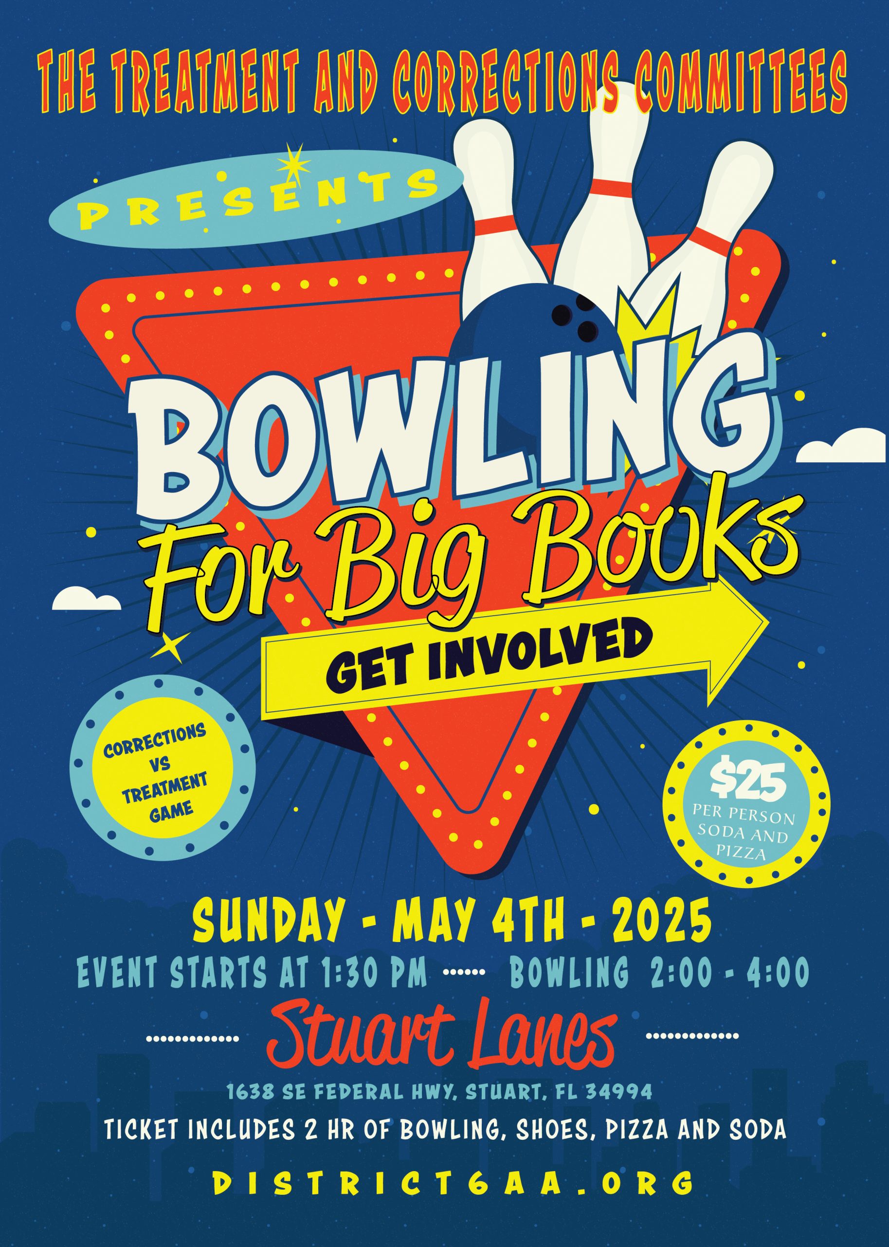 « All Events This event has passed. District 6 Bowling for Big Books May 4 @ 1:30 PM - 4:00 PM « FCYPAA Sobriety Under The Stars Founders Day Luncheon, Ice Cream Social and Chili Cook-Off » Add to calendar Google Calendar iCalendar Outlook 365 Outlook Live Details Date: May 4 Time: 1:30 PM - 4:00 PM Organizer District 6 Treatment & Corrections Committee Email corrections@district6aa.org Venue Stuart Lanes 1638 SE Federal Hwy Stuart, FL 34994 United States + Google Map