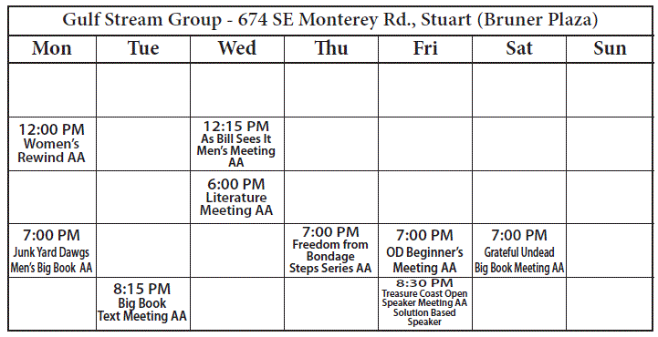 This website is neither endorsed by nor affiliated with Alcoholics Anonymous World Services, Inc. The sole purpose of this website is to help carry the A.A. message to the alcoholic who still suffers. This website is maintained as a resource of public information by Martin County Intergroup, and the Seventh Tradition of Alcoholics Anonymous. This iste is fully supported by the Martin County A.A. groups it serves. The trademarks A.A. and Alcoholics Anonymous©, The Grapevine©, and The Big Book© are registered trademarks of Alcoholics Anonymous©.