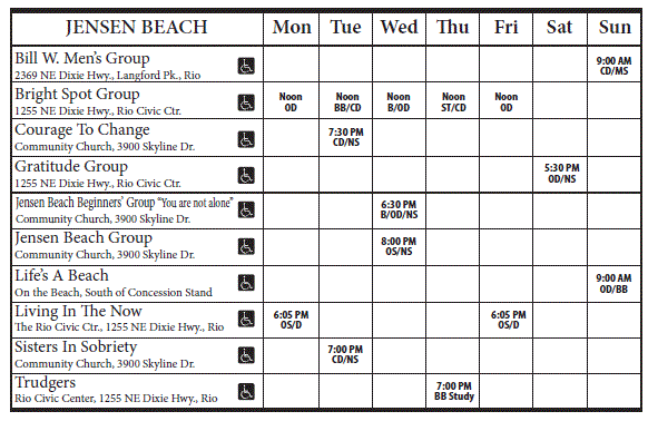 CD: Closed Discussion OS: Open Speaker B: Beginner ST: Step OD: Open Discussion CS: Closed Speaker BB: Big Book NS: Non Smoking S: Smoking S/Q: Speaker Question |